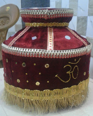 So sharing the pic of a simple steel matki decorated with maroon velvet cloth, laces, and embellishment.